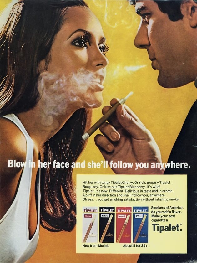 So, does sex actually sell? Some of the popular advertisements I have attached are remarkably offensive. Even ridiculous. Take a look at the Tipalet cigarette advertisement. Isn’t it just the hottest to have a man blow cigarette smoke all over your face? Not.