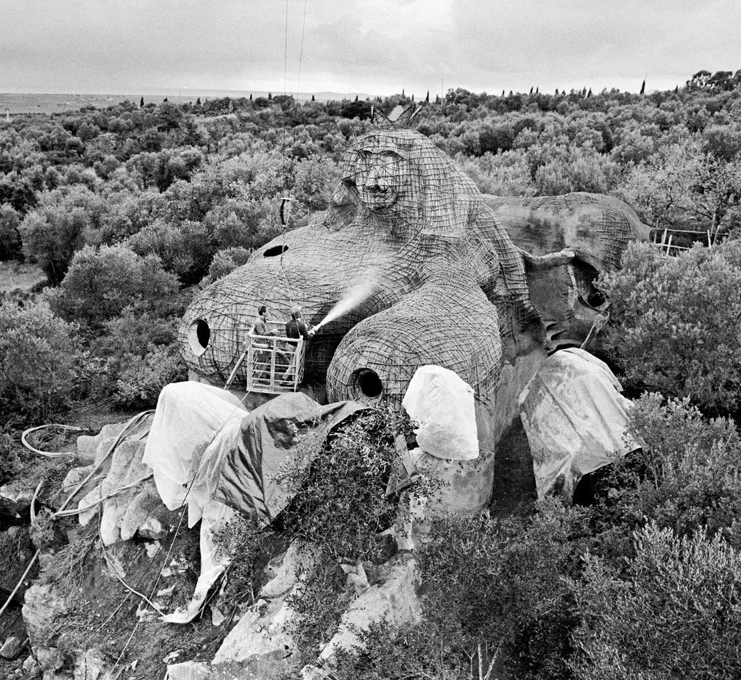 The process of making the larger sculptures was a long, labor intensive, and fully immersive experience for Phalle and everyone on her team. The basic structure of the sculptures were first welded with iron, covered again with another layer of iron, then covered with a layer of wire mesh.